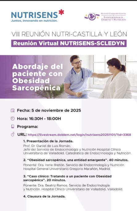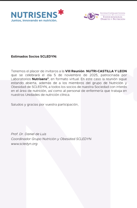 Desde el grupo de Nutrición y Obesidad de SCLEDYN tenemos el placer de invitaros a la VIII Reunión NUTRI-CASTILLA Y LEÓN, que se celebrará en formato virtual el miércoles 5 de noviembre de 2025, con el patrocinio de Laboratorios Nutrisens®.