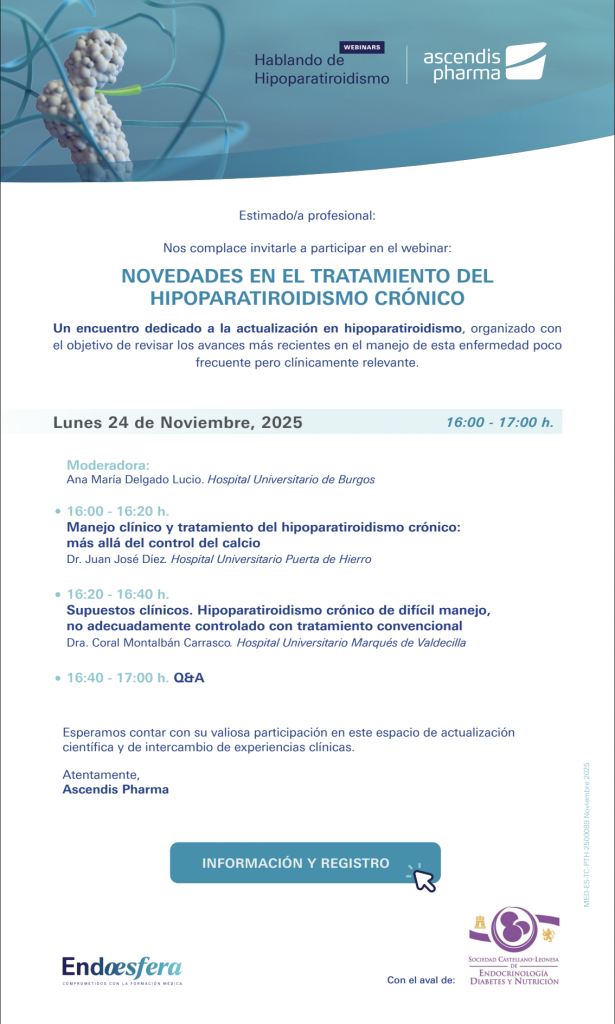 Este webinar está dedicado a la actualización en el manejo clínico del hipoparatiroidismo crónico, una enfermedad minoritaria con importantes implicaciones en la práctica endocrinológica.